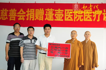 保定佛教转佛教在线厦门讯 2010年9月28日,受厦门南普陀寺慈善会会长圣辉法师嘱托,普陀法师、德鸣法师、通灵法师、静仁法师等一行到福建省永春县蓬壶中心卫生院,参加“厦门南普陀寺慈善会捐赠蓬壶医院医疗设备仪式”。南普陀慈善会为该院捐赠一台全数字B超机、一台电脑、工作站一套,总价值近11万元。