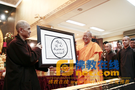 一行禅师向定盛法师赠送上一幅主题为“这是快乐时光”的字画