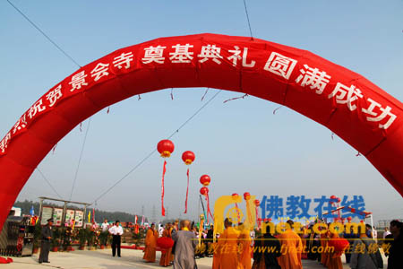 台湾灵鹫山创始人心道法师,江苏省佛教协会副会长、徐州市兴化寺方丈果光法师,连云港海宁寺昌鉴法师,安徽省佛教协会副会长园藏法师等出席奠基洒净仪式。良辰吉时于景会寺与中华文字艺术园预定地,由诸山长老主法进行洒净奠基仪式,如法如仪的奠基法会令与会大众皆感受到典仪的隆重庄严。心道法师致词时表示,「两岸佛教近年来频繁的交流与深入,对于佛教文化传承与保存有着深重的意义,景会寺的复建除了是信众参佛祈愿的重要场所之外,中华文字艺术园对于中华文化的传动,也同样负有重要的使命。」
