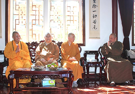 隆相法师陪同定海长老一行参观了栖霞古寺,监院谛如法师介绍了栖霞古寺的历史和文化。定海长老一行在法堂恭敬诵持本师释迦牟尼佛佛号和心经,供养佛陀顶骨舍利。