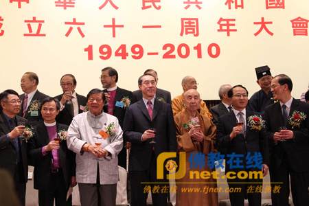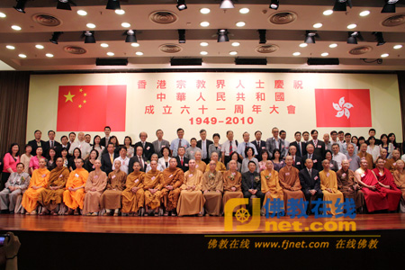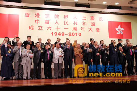 保定佛教转佛教在线香港讯 2010年9月21日下午6时,香港宗教界人士在九龙尖沙咀柯士甸道八号龙堡国际宾馆胡应湘堂隆重举行庆祝中华人民共和国成立六十一周年大会,并由香港特别行政区政府政务司司长唐英年先生、中央人民政府驻香港特别行政区联络办公室副主任王志民先生、香港特别行政区政府民政事务局局长曾德成先生主礼。