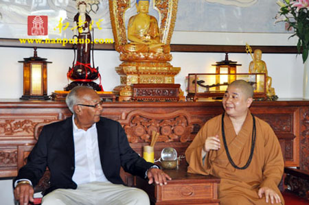 厦门市佛教协会会长、南普陀寺方丈则悟法师,南普陀寺监院界象法师、知客德煌法师、书记圣智法师等在天王殿前热情地接待了理查兹夫妇。则悟法师陪同外宾参观了南普陀寺天王殿、大雄宝殿、大悲殿等处。随后,宾主双方在方丈楼进行了亲切友好的交谈,则悟法师代表常住将一尊陶制观音像赠予理查兹夫妇以作纪念。南普陀寺书记圣智法师担任此次活动的英文翻译。