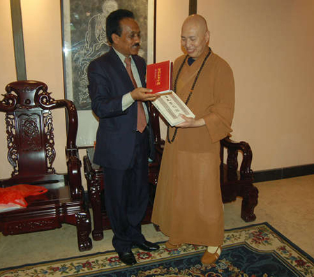 大安法师在会见时说,佛陀跋陀罗尊者是中国大乘佛法的伟大传播者,并和当时的中国佛教领袖人物慧远大师建立了非常深厚的友谊。慧远大师为佛陀跋陀罗尊者翻译经典、传播大乘佛法提供了条件。佛陀跋陀罗尊者圆寂后被葬在东林寺,他是东林寺白莲社的十八高贤之一,是一位具有很高道德智慧的圣者。他说,大使的到来是东林寺进一步将塔院整修好的缘起,同时也欢迎尼泊尔信众参访东林寺、瞻礼佛驮跋陀罗尊者舍利塔。