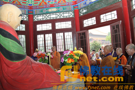 日本天台宗布教师会一行在宽旭法师的引领下,首先到大雄宝殿礼佛并举行诵经祈福法会、到慈觉大师纪念堂礼拜了圆仁法师法相。接着,日本天台宗布教师会一行与宽旭法师一起在文殊殿后方种植了象征中日友好的常青树,在宽旭法师的陪同下到金刚堂参加了寺院举办的地藏王菩萨圣诞法会。