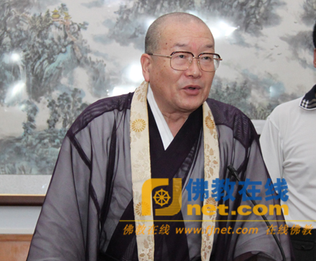 宽旭法师首先代表大兴善寺两序大众对日本天台宗布教师会一行人的到来表示欢迎。他向日本天台宗布教师会一行人介绍了圆仁法师到长安后,入驻大兴善寺及在寺院学习佛法及交流等事迹。他说,大兴善寺与圆仁法师已有1200年的友谊,圆仁法师到长安后首个夜晚即入住在大兴善寺,所以他与大兴善寺的缘分是非常深的。圆仁法师在长安求法的五年中到多座著名寺院进行了拜访,并写成了《圆仁日记》。《圆仁日记》真实的、详细的记载了长安当时的佛教及社会状况。宽旭法师还表示,他每次去日本都能感觉到圆仁法师的伟大,这次代表团来寺院诵《阿弥陀经》期间,虽然我们语言不通,但是我们仍然能够一起诵读《阿弥陀经》,说明大家的心是相通的,希望通过今日的交流活动,使大兴善寺和日本天台宗关系更进一步,并希望大家今后每年都到大兴善寺参访交流。