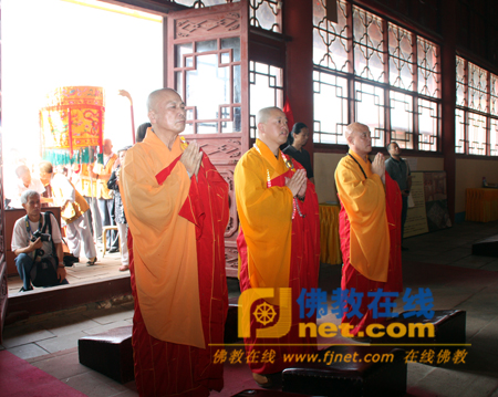 中国佛教协会副会长、江西省佛教协会会长、南昌佑民寺方丈纯一法师,中国佛教协会副秘书长、北京市广济寺方丈演觉法师,台湾十方禅林方丈首愚法师在观海寺大雄宝殿礼佛