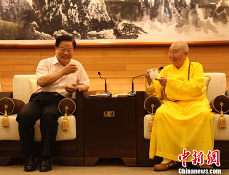 蔡武进而向惟觉长老谈到:昨天在台中,有记者问我到台湾有无特别感受,“我说,我没有到了异乡的感觉,觉得好像就在非常熟悉的地方,为什么呢?两岸都同属中华文化。”