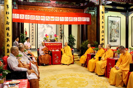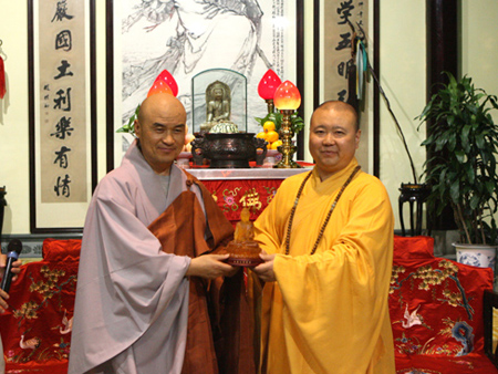 中国佛教协会副会长、上海市佛教协会会长、玉佛禅寺方丈觉醒法师在方丈室接见了参访团一行。