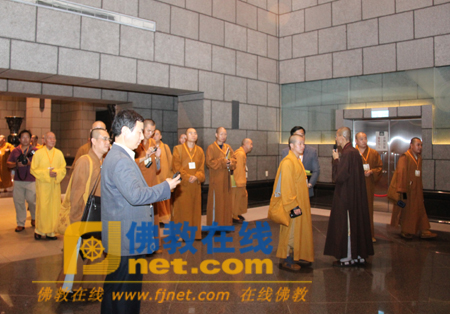 中台禅寺副住持见尊法师为大陆佛教代表团成员导览、介绍中台禅寺的各殿堂