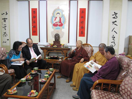 保定佛教转佛教在线台湾讯 世界佛教徒友谊会秘书长Phallop Thaiarry伉俪于2010年8月29日下午三时,在台湾中国佛教会常务理事、台北市佛教会理事长明光法师及佛光大学游祥洲博士伉俪陪同下,到台湾中国佛教会参访,台湾中国佛教会理事长净良长老等热情接待,双方就如何将佛教爱好和平的理念推广到世界各地交换意见。