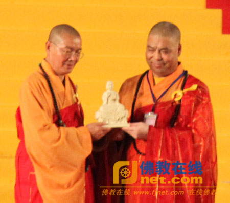 大陆佛教代表团团长增勤法师向大会主席致赠佛像