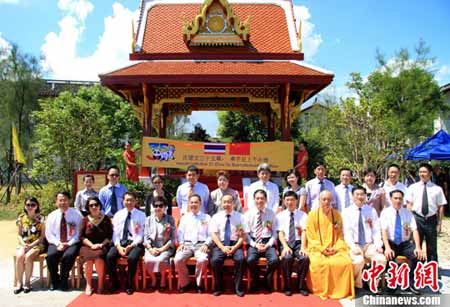 据悉,“自在亭”是一座泰国最为典型的尖角飞檐凉亭,高8米、占地17.3平方米,顶部用玻璃雕刻莲花等图案,与佛教相连;整座塔的颜色由蓝、白、金、红组成,象征中泰之间的深厚友谊;在亭的内部还雕刻莲花和泰国花卉,意寓吉祥如意。 图为嘉宾在泰式凉亭前合影留念。(图片来源:中国新闻网)