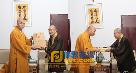 演德法师代表大兴善寺住持宽旭法师接待了清原净田长老。他说,界明法师对大兴善寺贡献很大,在大兴善寺的修建、僧团的教育、寺院的管理上都费了一定的心血;界明法师圆寂后,宽旭法师接任大兴善寺住持并继承界明法师遗愿完善后续建设等工作;圆仁-慈觉大师在中国佛教界受信众敬仰,圆仁-慈觉大师的精神更是深深的受到大兴善寺佛教徒的敬仰,希望清原净田长老有机会再次访问大兴善寺,并希望日本的佛教界也能够常来大兴善寺访问交流。