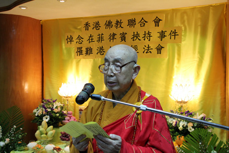 保定佛教资讯 转讯:2010年8月26日,香港佛教联合会为菲律宾挟持事件中遇害港人举行追思诵经法会,由港佛联会长觉光长老、总务主任智慧法师、常务董事绍根法师及融灵法师等领导主持。法会主要是祈求亡者,往生极乐世界;并祝愿生还者,早日康复,消除阴霾,重拾自在。