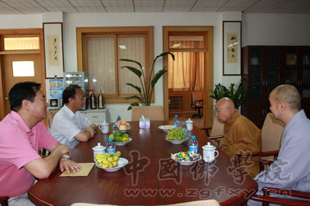 信息来自佛教在线 2010年8月16日下午,北京市宗教局申建军局长、谭林副局长到中国佛学院拜访中国佛教协会会长、中国佛学院院长传印长老,副院长兼教务长宗性法师陪同会见。