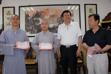 信息来自佛教在线 2010年8月17日上午10时,天津大悲禅院监院大如法师、文高法师受该寺方丈智如法师委托,向甘肃舟曲特大泥石流灾区捐款11万元,由河北区红十字会转交。其中,智如法师个人捐款1万元。