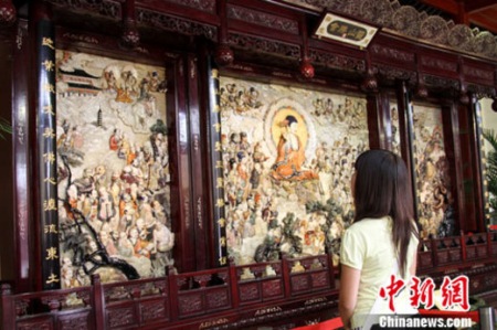重达3吨半的主体展品、巨幅玉雕佛壁《灵山胜会》最让观众称奇。它汇集了佛主、4大菩萨、500罗汉等佛教人物,由16位艺术巨匠花费17年时间创作,创作中巧妙运用了近20种材质玉石的天然色彩,画面中千人千面、栩栩如生。小故宫森磊观博物馆主人陈学明说,《灵山胜会》整体呈现了日月祥光、和谐安定、佛光普照、世界和平。