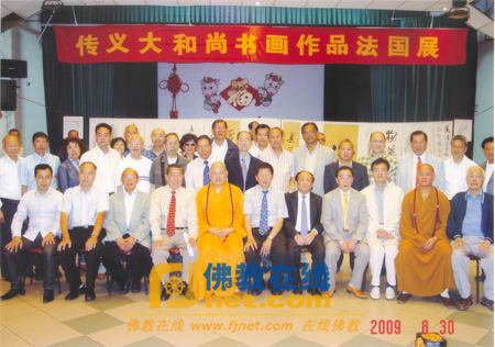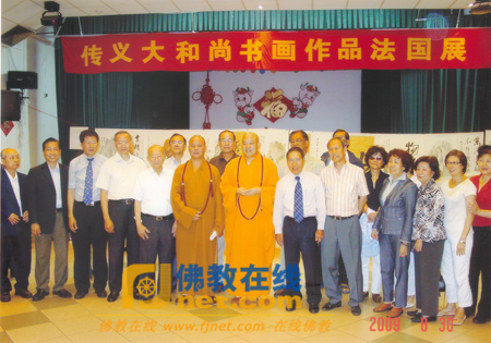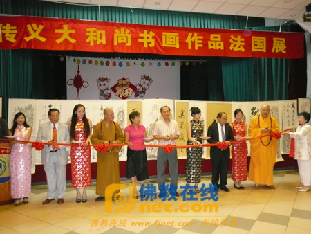 保定佛教资讯网讯 巴黎时间2009年8月30日下午,中国南京毗卢寺方丈传义法师“传义大和尚书画作品法国展”在法国首都巴黎开展。中国驻法国公使衔参赞宋敬武、领事参赞何淑琴、法国总统顾问何福基、法国华商会长郑辉等为开幕式剪彩。当地43个华人社团代表及来自欧洲各地的艺术家参加了隆重的开幕式。