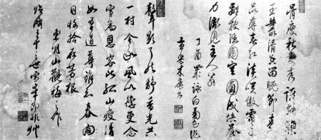 瑫(1611—1684年)的作品连在一起,为镜框水墨纸本,作于1657年。即非如一的题识为“声影了然静,香光共一寸。合家风以德,更念雪为恩。容此孤山瘦,清如吾道尊。谁意春面目,收拾在芳根。东明山观梅之作。济之十之世雪峰即非草”,拍卖价为5000—8000元。
