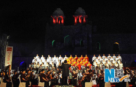 保定佛教资讯网讯:2010年4月20日晚,由印度文化关系委员会和中国文化部联合主办的2010“中国节”开幕式在印度首都新德里隆重举行。融合佛教音乐和现代交响乐的《神州和乐》进行了开幕演出。中国全国政协副主席孙家正和印度旅游部长库马里·塞尔贾出席了开幕式。