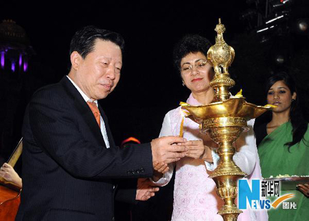 孙家正(左)与库马里·塞尔贾在开幕式上进行印度传统点灯仪式