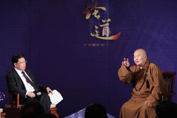 保定佛教资讯网讯:「观天下风云,与永图论道」,佛光山开山宗长星云大师 5月23日下午接受贵州卫视《论道》节目邀请,于无锡灵山梵宫与中央社会主义学院第一副院长叶小文先生,和主持人博鳌亚洲论坛秘书长龙永图先生以一同「论道」,共同阐述「世界公益」。