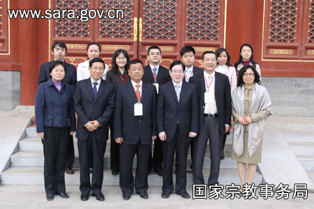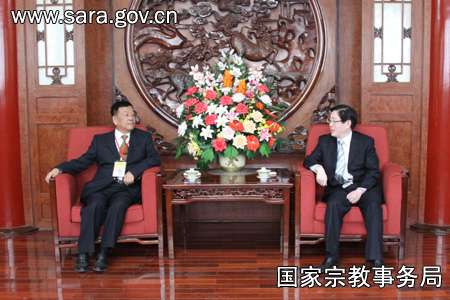 保定佛教资讯网讯:2010年4月23日下午,国家宗教事务局局长王作安在贵宾厅会见了澳门中华宗教文化交流协会访问团一行。 宾主双方就今后内地与澳门在宗教文化领域的交流合作,进行积极坦率的交流。蒋坚永副局长及有关部门负责人参加了会见,并于当晚宴请了客人一行。(图:张建)