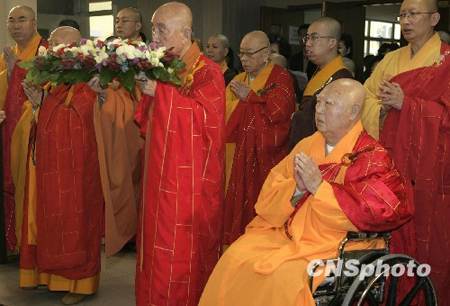 持续一个半小时的法会,首先进行默哀,然后由觉光长老引领港府代表和中央驻港联络办的代表,为地震死难者献香和献花。觉光长老最后带领全体信众诵经,向千里之外的玉树灾民送上祝福。