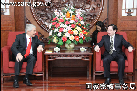 保定佛教资讯网资讯:2010年3月19日,国家宗教事务局王作安局长会见了到访的美国著名布道家路易·帕劳先生一行。 王作安局长向对方介绍了中国政府的宗教信仰自由政策,并与其就促进中美基督教交流与合作问题进行了探讨。