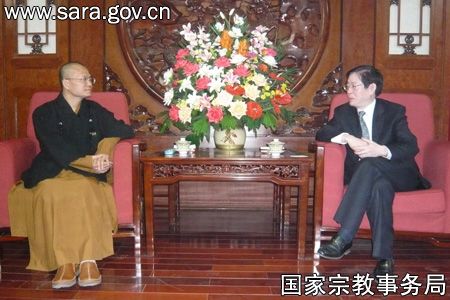保定佛教资讯网讯 2010年1月18日晚,国家宗教事务局王作安局长在局贵宾厅会见了佛光山住持心培法师一行6人。宾主双方回顾了近年来两岸佛教交流中的大事,特别对去年举办的第二届世界佛教论坛给予了高度评价。