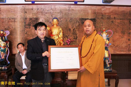 王平安主任向宽池法师颁发兴教寺新的“宗教活动场所登记证”