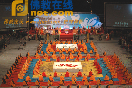 闭幕式最后,举行祈愿和谐献灯祝福仪式,祈求世界和平以及这波金融风暴能够尽速平息。数百位法师分别围坐于 “和”、“谐”二字及莲花标识四周,双手合十,在片片飘落的菩提叶中,与现场数万信众齐颂《吉祥偈》、《文殊心咒》、《启告十方》等经文。点点灯光燃起,“福我世界、国富太平、社会安和、人民乐利……”的传颂声远播四方,“和谐世界、众缘和合”的主题亦跨越两岸、遍传世界。(本站记者 丁志勇、刘耀畬、子勤 现场报道)