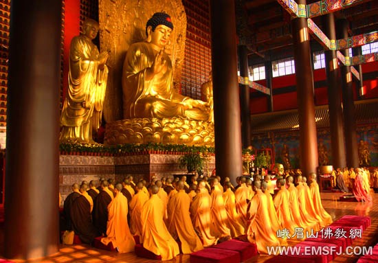 评语:大殿雄伟宽阔,佛像庄严肃穆,海众云集,颂佛祝祷。该图采用超广角拍摄,使画面更具视觉效果,展示了圣殿的庄严与宏大,体现了峨眉山众僧对佛教文化的传承与发扬。